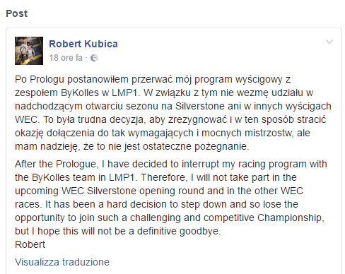 Dopo il prologo di Monza ho ritenuto opportuno interrompere il mio programma con la ByKolles. Di conseguenza non sarò presente né all’evento di apertura della stagione a Silverstone, né in nessun’altra gara nel WEC 2017. Non è stato facile decidere di fare un passo indietro e perdere così la chance di entrare in un campionato tanto difficile e competitivo. La speranza è che questo non sia un addio definitivo.