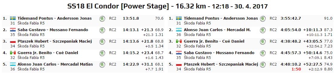 Dopo il forfait improvviso di Eric Camilli l’unico avversario di Tidemand potevano essere i problemi tecnici o degli incidenti, come testimoniamo gli oltre dieci minuti di margine tra lo svedese di Skoda ed il primo degli inseguitori, l’argentino Juan Carlos Alonso. Per la casa ceca è stato un grande weekend dato che, oltre alla macchina ufficiale di Tidemand e quella privata del pilota locale, una terza Fabia è giunta sul podio di classe; stiamo parlando di quella condotto dal messicano Benito Guerra e gestita da Motorsport Italia. A completare un vero e proprio monopolio della casa di Plzen gli altri due driver , Gustavo Saba e Hubert Ptaszek, hanno chiuso rispettivamente quarto e quinto.