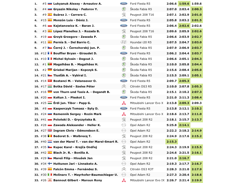 Alexey Lukyanuk, vincitore dell’edizione 2016, ha portato in prima posizione la sua Ford Fiesta R5 in questa fase di qualificazione. Il pilota russo è stato l’unico a rimanere sotto i due minuti.
