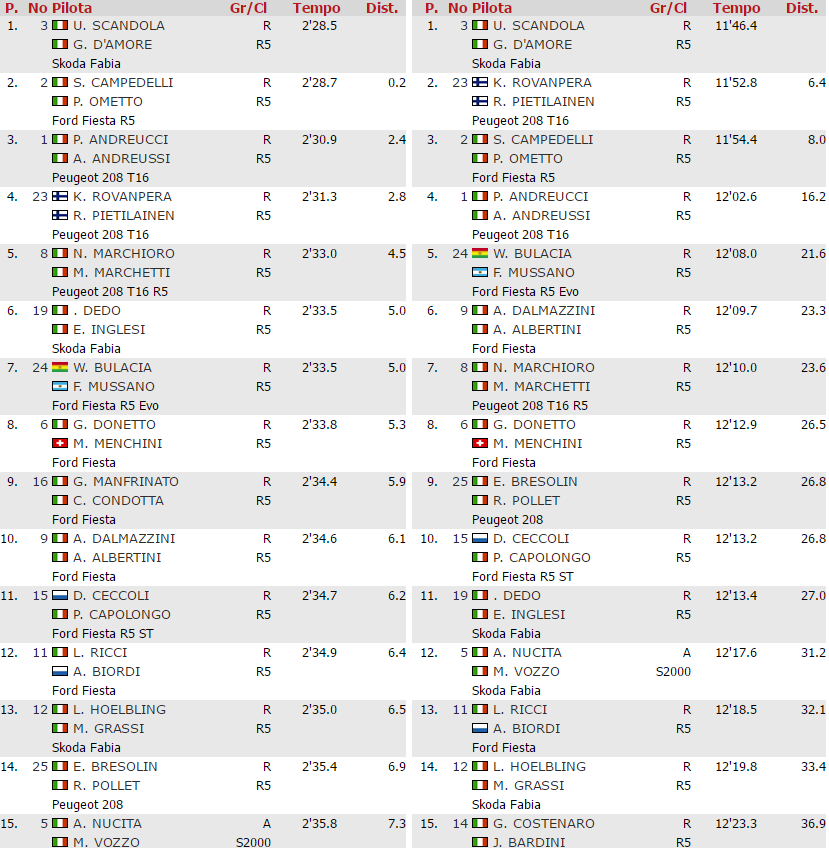Nella generale dopo tre PS è Scandola a comandare con un vantaggio di quasi 7 secondi su Kalle Rovanpera e 8 secondi sul romagnolo Campedelli. Giu dal podio staccato di quasi 14 secondi c’è Paolo Andreucci tallonato da Bulacia.