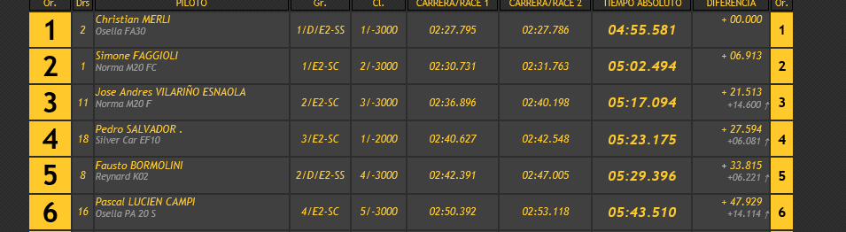 Sempre al terzo posto, staccato di 9.1 secondi, lo Spagnolo “Sempreverde” Andres Vilarino, su Norma M20 F, e quarto a 12.8 sec il locale Pedro Salvador, in gara su Silvercar EF10.