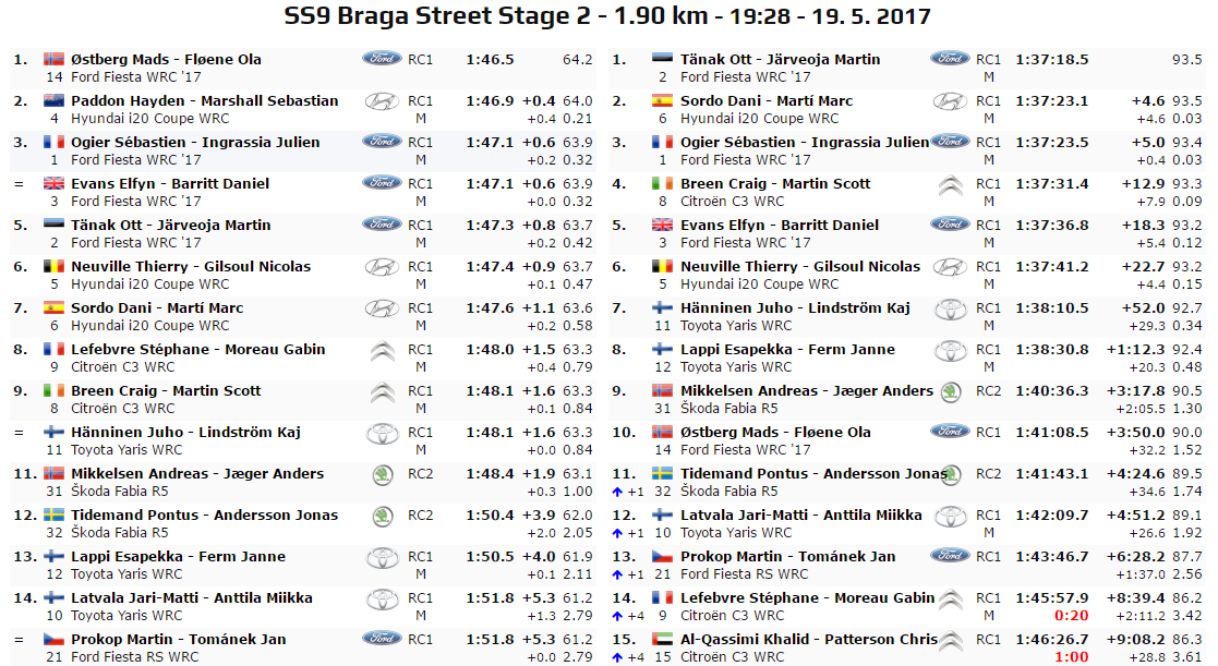 Con le due prove spettacolo “Braga Street Stage” è terminata la prima giornata di gara del Rally del Portogallo 2017. Una prima tappa che ha subito uno scossone in classifica dopo la settima speciale, la quale ha decretato la graduatoria finale di questa prima parte di corsa.