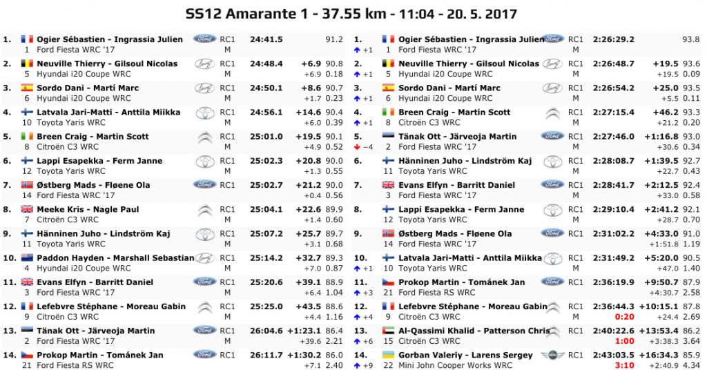 Ma è sulla SS12 Amarante 1 di 37.55 km, la prova piĂą lunga di giornata, che la gara subisce un altro colpo di scena. Ott Tanak sbaglia toccando un terrapieno a 20 km dall’arrivo e subisce una rottura che ne compromette la gara lasciando per strada ben 1 minuto e 23 secondi.