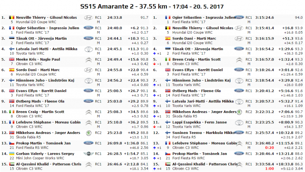 Il Day 2 portoghese si chiude la PS15, “Amarante 2” di 37,55 km. Botta e risposta tra il belga e il francese. E’ il turno di una spettacolare prova condotta da Thierry Neuville, stacca un ottimo tempo e stacca un cauto Seb Ogier che mantiene però oltre 16 secondi sul secondo. Podio di speciale per l’altro pilota M-Sport, ovvero Ott Tanak che con l’ennessimo buon risultato scavalca in generale un Craig Breen solo decimo a causa di lesioni alle gomme.