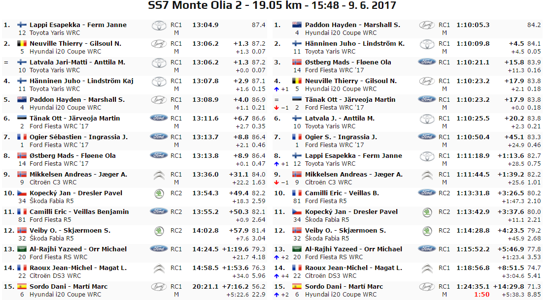 Ed ecco il turno della PS7, “Monte Olia 2”, 19,05 km. Si conferma ancora una volta vincitore di speciale, uno scatenato Esapekka Lappi che sembra essere sempre più in confidenza con la Yaris. Toyota comunque che ha fatto da padrona a questa speciale viste anche la terza e la quarta posizione ottenuta rispettivamente da Latvala e Hanninen. A interrompere la tripletta nippo-finlandese ci ha pensato Thierry Neuville che, nonostante una foratura all’anteriore sx, è riuscito a chiudere col secondo tempo. Ottimo tempo con oltre 7 secondi rifilati ad Ogier. Paddon si mette sulla difensiva e chiude quinto.