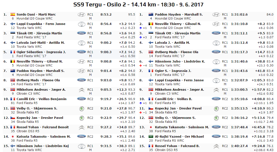 Di tutto questo ne approfittano le altre due Toyota, con Latvala al quarto posto a soli 9″8 ed Hanninen, che se non avesse commesso un errore nell’ultima prova di giornata avrebbe potuto essere davanti al suo caposquadra. Il finnico è comunque ancora in gara, danni alla vettura permettendo, dato che occupa la sesta posizione staccato di 38 secondi da Paddon. In mezzo alle due Toyota Yaris si è inserita la Fiesta privata di Mads Ostberg, leggermente in calo rispetto alla mattinata ma comunque ancora in grado di lottare per le posizioni importanti.