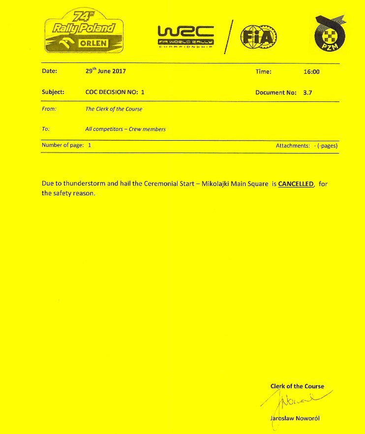 E’ di pochi minuti fa il comunicato emanato dagli addetti ai lavori circa l’annullamento della cerimonia ufficiale di partenza del Rally di Polonia, ottavo round del campionato del mondo di scena in questo fine settimana.La causa che ha spinto gli organizzatori a prendere questa drastica decisione è la pioggia torrenziale caduta nelle ultime ore presso il rally village che avrebbe dovuto ospitare lo start della gara. Per sicurezza dunque la pedana di partenza non si svolgerĂ e dunque le ostilitĂ si apriranno ufficialmente stasera alle 19.08, con la prima vettura che entrerĂ nella prova spettacolo denominata Mikolajki Arena 1.