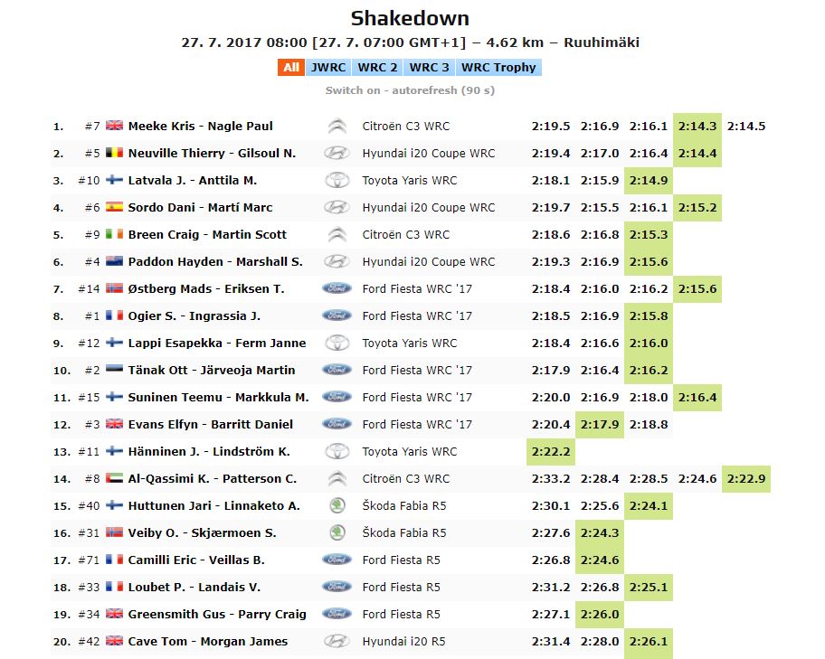 Nei cinque giri sui 4.62 km di Ruuhimäki il pilota britannico ha dimostrato prestazioni in crescendo fino a staccare il miglior tempo 2:14.3. Subito attaccato ad un decimo Thierry Neuville su Hyundai che dimostra il suo attuale stato di forma. L’attesissimo pilota di casa Jari-Matti Latvala da queste parti non ha sicuramente bisogno di adattarsi. Un giro in meno rispetto a Meeke e miglior tempo a 6 decimi. Dani Sordo prende circa un secondo e dimostra un particolare distacco di “tutti gli altri” rispetto al duo di testa attuale.