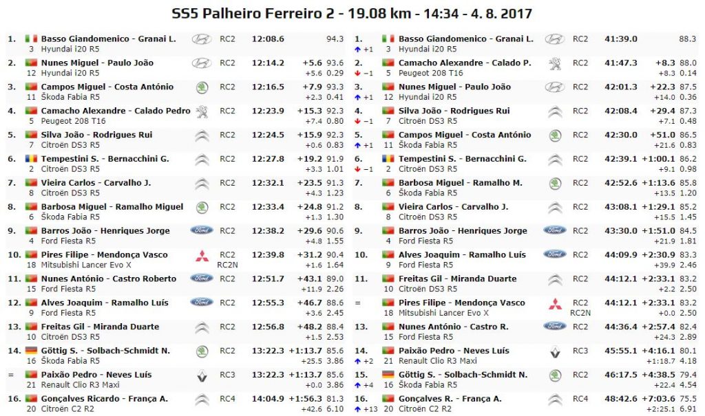 Sulla SS 2 Campo de Golfe (ripetuta poi per la SS4) Basso non si trova mai a suo agio e stacca tempi abbastanza distanzi dal pilota di casa Alexandre Camacho (Peugeot 208 T16) che vince entrambi i passaggi sulla prova, seguito dall’altro portoghese Miguel Barbosa su Skoda Fabia R5. Leggermente meglio Simone Tempestini col quarto tempo dietro a Lefebvre.