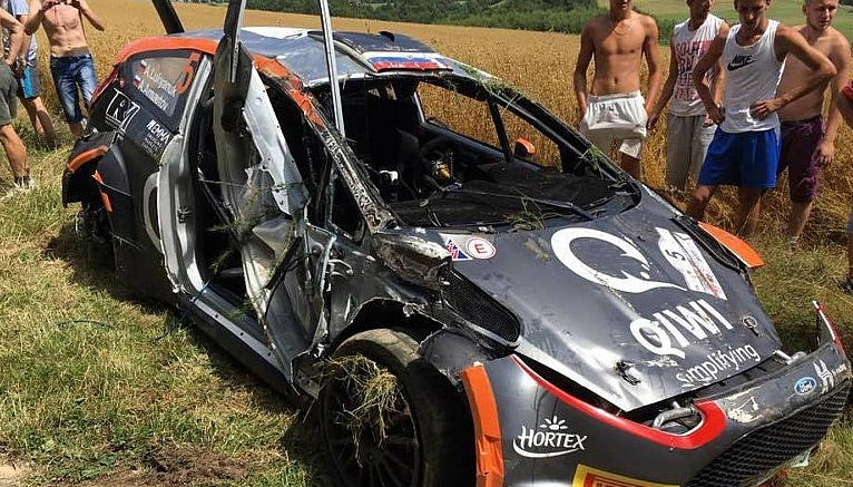 Ho iniziato a girare verso destra piuttosto presto, immaginando che fosse una curva veloce come avevo supposto seguendo le indicazioni dei miei appunti; sono stato troppo aggressivo e abbiamo centrato il fosso in uscita, impennandoci sulla banchina e capottando diverse volte lungo la strada. A parte un paio di abrasioni di poco conto, tutti e due stiamo bene.