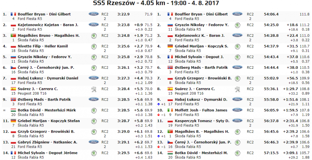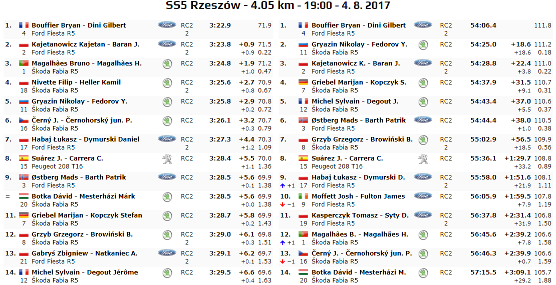 La prima giornata di gara al Rally Rzeszow si chiude con Bryan Bouffier, a bordo della sua Ford Fiesta R5 del Gemini Clinic Rally team, al comando. Il pilota francese domina ben 3 speciali su 5 disputate e vanta un cospicuo vantaggio sugli inseguitori, primo dei quali è Nikolay Gryazin con la Skoda Fabia R5.