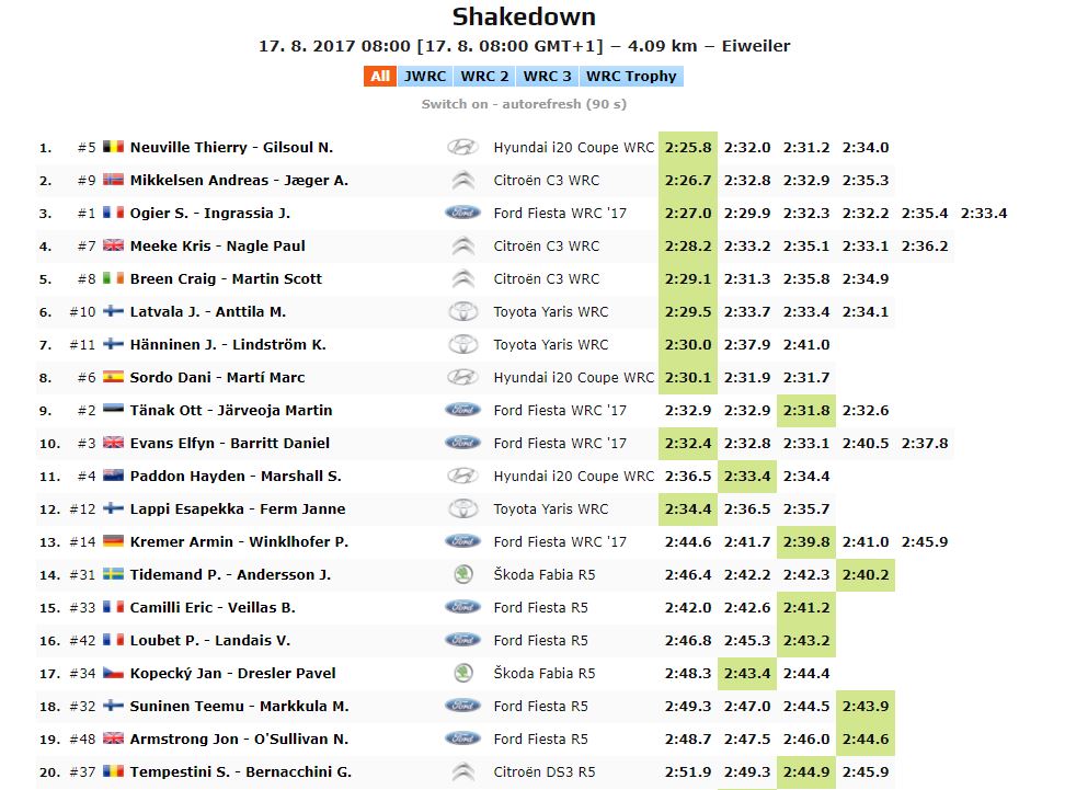 All’ADAC Rally di Germania 2017 gli equipaggi hanno iniziato ad assaggiare il terreno con lo shakedown. 4 km di prova speciale ad Eiwiler, resi piuttosto insidiosi da un tratto in mezzo al bosco andatosi via via riempiendosi di fango proveniente dai vari tagli. Non a caso i tempi migliori sono stati registrati al primo passaggio con Thierry Neuville davanti a tutti.
