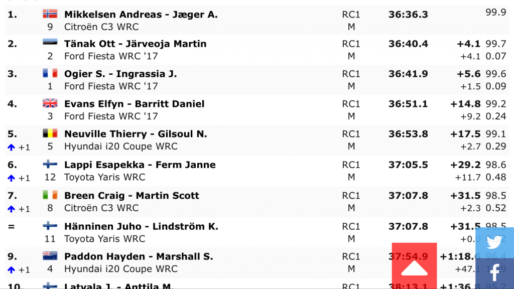 Terzo il suo compagno di squadra Sebastien Ogier, autore sulla prima prova di giornata di una lieve uscita di strada con conseguenti ammaccamenti della sua Fiesta. Quarta piazza per l’altra Fiesta Wrc griffata D-Mack del britannico Elfyn Evans, autore fin qui di una gara regolare.