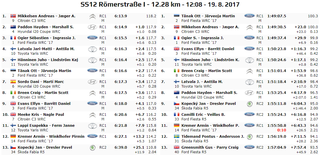 Sulla stessa speciale nella quale il driver belga ha abbandonato i suoi sogni di gloria, Ott Tanak ha inaugurato la seconda tappa con un miglior tempo, poi replicato nella ss11. Insieme ad altre solide prestazioni sugli altri due dei quattro tratti cronometrati di questa mattina, l’estone si è confermato al vertice della classifica generale anche in questa prima metĂ di giornata. Una gara fin qui impeccabile per il pilota di M-Sport, il quale si sta confermando competitivo su un fondo a lui non prediletto. A metĂ tappa sono 23 secondi netti il suo vantaggio sul suo piĂą diretto inseguitore.