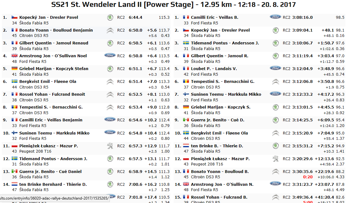 Nel WRC2, al Rally di Germania, primo posto per il Francese di casa M-Sport Eric Camilli, che con la sua Ford Fiesta R5 EVO2 ha inflitto 48 secondi al Ceco Jan Kopecky, pilota ufficiale Skoda Motorsport, e 1:50.7 allo Svedese Pontus Tidemand, anche lui su Skoda Fabia R5 Ufficiale, che si è laureato in questo rally CAMPIONE DEL MONDO WRC2.