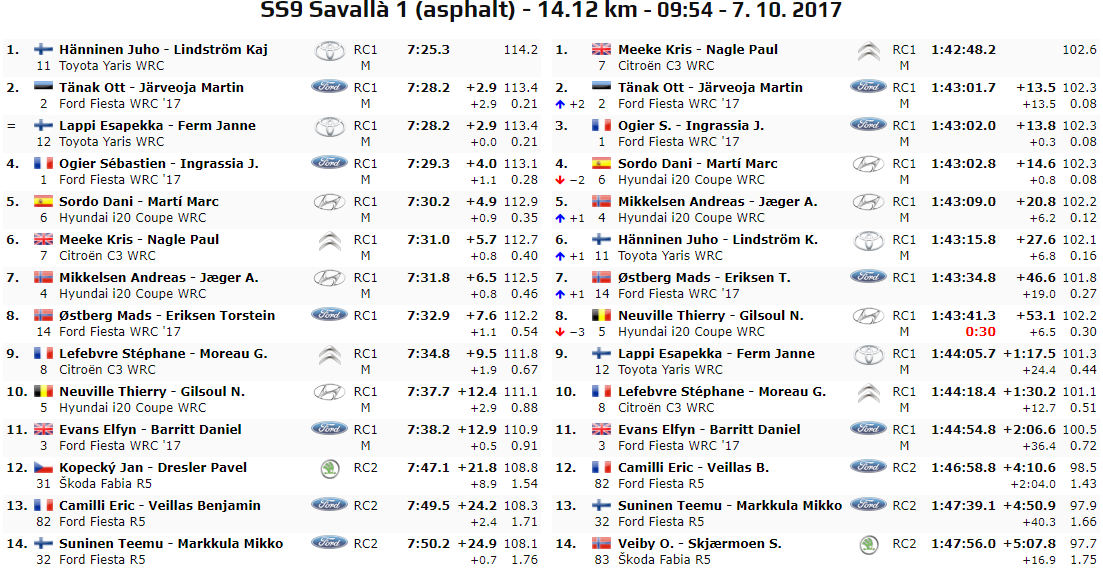Mattina conclusa con la PS9 “Savallà 1”. Il chilometraggio si abbassa a 14,12. Colpo di scena in questa ultima prova. Il belga Thierry Neuville è colto da problemi idraulici e gli viene inflitta una penalità di 30 secondi. Questo imprevisto gli costa ben 3 posizione in classifica generale. Occupa attualmente l’ottava piazza a quasi un minuto di ritardo dalla vetta. Mondiale sempre più lontano per lui.