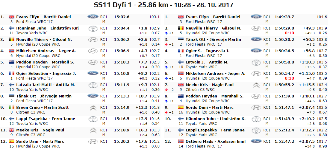 Ed ecco il turno della PS10 “Gartheiniog 1” – 12.61 km. Tris di Evans che vince anche la speciale n.10. Tempi comunque molto ravvicinati fra i piloti di testa. Il duo Hyundai composto da Neuville-Mikkelsen fanno segnare il secondo e terzo tempo a una manciata di decimi dal leader classifica. Così facendo, il belga Hyundai scavalca nella generale Seb Ogier. Il transalpino è autore di un passaggio opaco, ma comunque occupa una quarta piazza insidiata da Kris Meeke, autore del sesto tempo, ma ancora distante una decina di secondo dal predecessore. Ancora sotto la top ten Craig Breen, dove galleggiano anche l’altra coppia Hyundai, composta da Sordo (9°) e Paddon (10°).