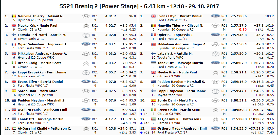 Le vetture coreane hanno concluso in maniera piĂą che dignitosa il penultimo appuntamento stagionale, dato che Andreas Mikkelsen ha conquistato due scratch rispettivamente sulla ss18 e ss20. E se lĂ davanti il vantaggio accumulato da Evans si è rilevato pressochĂ© incolmabile, nelle posizioni di rincalzo il gap che separava i vari protagonisti era ridotto. Ed infatti, grazie a questi miglior tempi il norvegese ha avuto ragione di Jari-Matti Latvala, quarto fino a due speciali dal termine ma relegato alla piazza marginale della top five. Il finnico ha risalito molte posizioni grazie ad una prestazione eccezionale nella prima notturna di ieri ma, in condizioni normali ed eccezion fatta per qualche sprazzo, ha mostrato un passo non all’altezza dei primissimi.