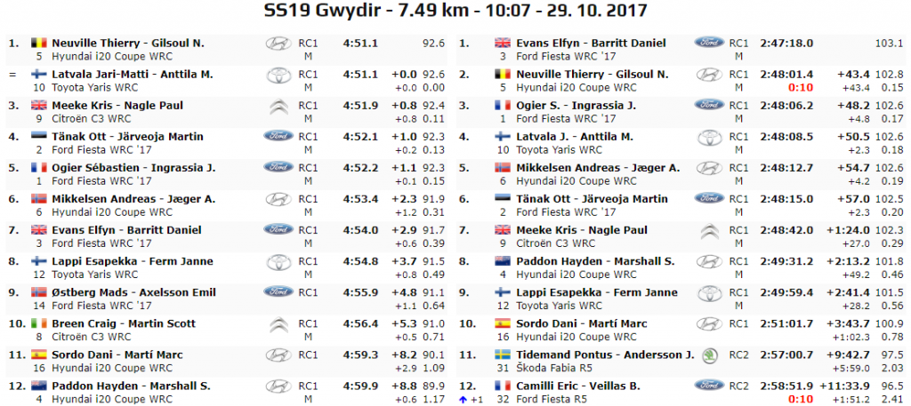 Andiamo poi alla PS19 “Gwydir” di 7.49 km. Chilometraggio ridotto in questa ultima parte di gara con tempi pressochè simili anche in questa prova. Ad avere la meglio è Thierry Neuville, pari tempo per JML e podio di speciale completato da Kris Meeke sempre sotto al secondo di ritardo. Quarto e quinto ad un secondo Tanak e Ogier ed ovviamente classifica immutata. Evans settimo, ma non ha piĂą niente da dire.