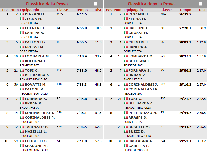 Alla guida della Ford Fiesta Wrc gestita dalla scuderia Biella Corse, Pinzano ha mostrato la sua netta supremazia aggiudicandosi tutti e quattro gli scratch sulla prova ormai classica della gara piemontese, la “Curino”. Una superioritĂ manifestata anche grazie alle performance della sua vettura, unica World Rally Car in gara insieme alla Ford Focus di Augustino Pettenuzzo. Quest’ultimo però è stato impossibilitato a giungere al traguardo di Biella, in seguito ad un ritiro sulla prova speciale numero 3, dopo una gara mai nelle posizioni di vertice