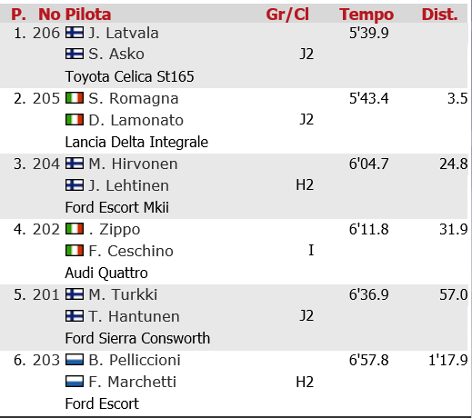 Tra le storiche invece, come preventivato, in testa ci è andato il fortissimo pilota Finnico Jari Matti Latvala, sulla sua favolosa Toyota Celica ST 165 ex Carlos Sainz, il quale ha staccato di 3.5 secondi il Vicentino Simone Romagna (Lancia Delta Integrale) e di 24.8 secondi l’ altro illustre ospite proveniente dalla Finlandia, Mikko Hirvonen, in gara con una Ford Escort MK2 GR.4 pavoneggiata da dei favolosi colori Rothmans.