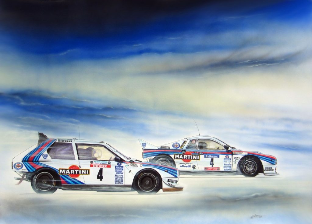 Un altro omaggio a Henri, Sergio, Attilio e ‘Icio, questa volta raffigurati con le loro 037 e S4 affiancate in una immaginaria prova speciale tra le nuvole. Stesso numero, stessa marca, stessa gara, stesso sponsor, sempre Martini. E ancora, Rallylegend 2015, vittoria nel contest Freem/AutoSprint per la t-shirt celebrativa del trentennale della S4. Claudio Lombardi mi fece i complimenti, perché secondo lui avevo colto in pieno il senso dell’evento. Però replicai perché io l’avevo solamente disegnata, ma lui e il suo staff quella macchina là l’avevano immaginata e fatta nascere, trent’anni prima. La foto con Claudio Lombardi e quella maglietta con la sua creatura che non ho disegnato io, al tempo. L’avevo semplicemente riprodotta trent’anni dopo. Ma adesso basta amarcord e basta Martini, altrimenti mi ubriaco. Comunque, tengo a precisare che ogni volta mi capiti di apprezzare una livrea disegnata da qualcun altro non penso mai “avrei voluto disegnarla io”. Se ciò che vedo mi colpisce davvero cerco piuttosto di imparare qualcosa di nuovo e, se conosco l’autore, mi complimento sinceramente con lui.