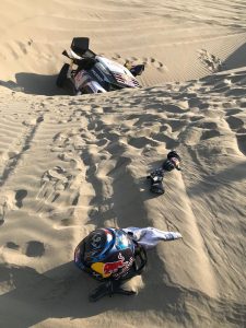 In prossimità di una duna, pochi km dopo il primo incidente, Daniel Elena ha risentito i postumi dell’ infortunio rimediato con la prima insabbiata, e i due sono stati costretti ad alzare bandiera bianca.