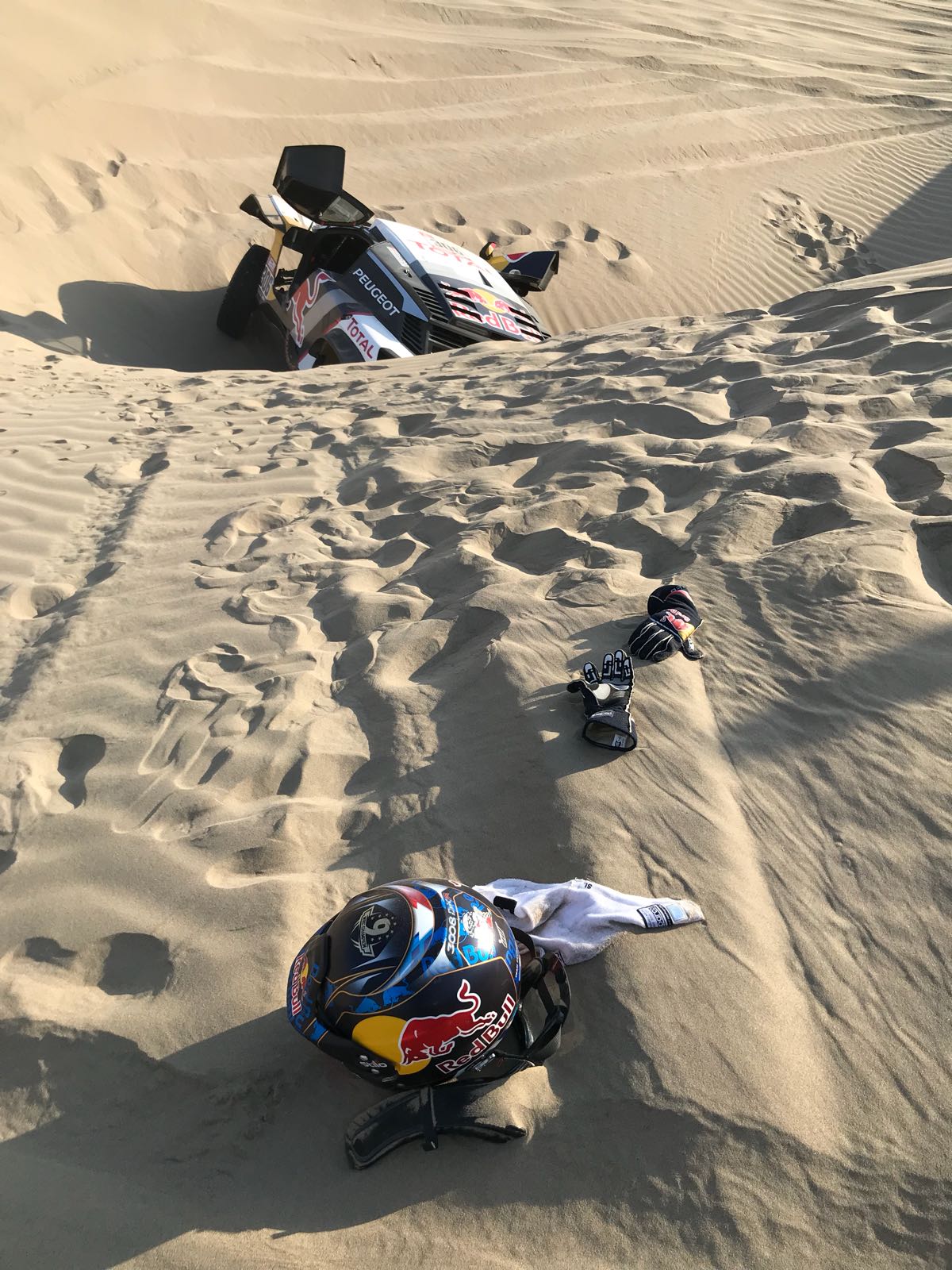 Dopo i primi quattro giorni di gara disputati con un andamento crescente, il Cannibale Francese Sèbastien Loeb, nei primi km di questa difficile e sabbiosa tappa numero cinque, ha visto sfumare tutti i suoi sogni di gloria e di quelli del suo leggendario Co-Equiper Daniel Elena, con prima un’ insabbiata, poi l’ infortunio di Elena dovuto a quest’ ultima che gli ha costretti al ritiro.