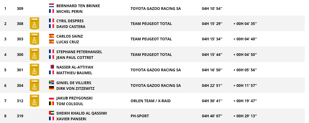 Dietro di loro, in quarta posizione assoluta, si piazza un minaccioso Bernhard Ten Brinke, il quale con la sua Hilux è ad 1h 17′ dal primo in classifica, ma a soli 3 minuti dal compagno di squadra Al-Attiyah, che al momento occupa il terzo gradino del podio.
