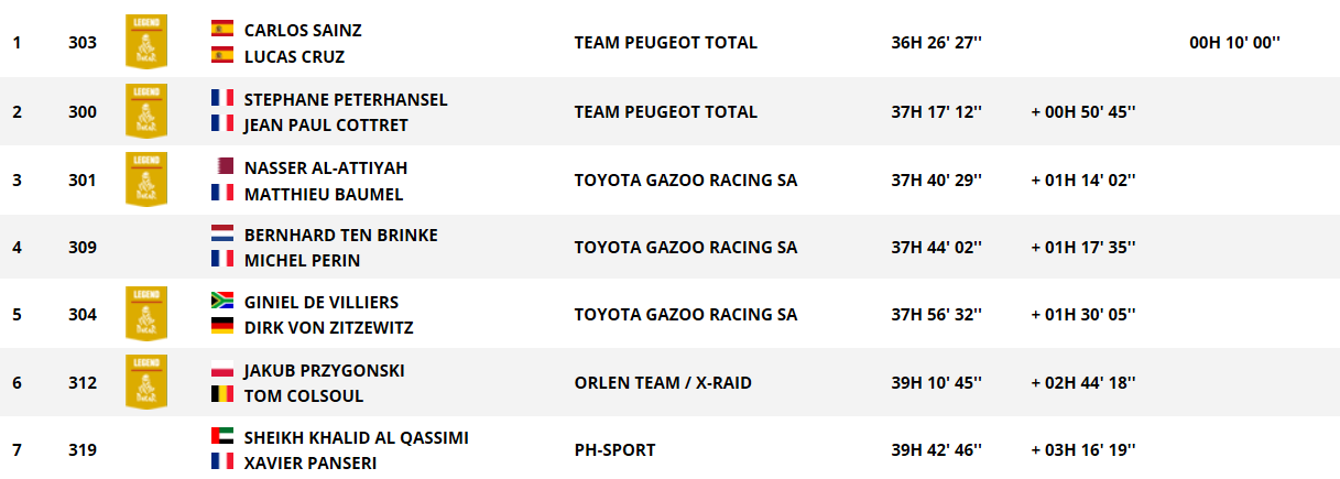 Nella classifica generale, invece, in testa si mantiene saldamente il Matador Carlos Sainz, il quale con la sua Peugeot 3008 DKR Maxi sente il profumo di vittoria sempre più vicino (ma alla Dakar non si sa mai…), con 50′ di vantaggio sul compagno di squadra Francese, Monsieur Dakar Stephane Peterhansel e con 1h e 14′ sul pilota del Quatar Nasser Al-Attiyah, primo tra le Toyota.