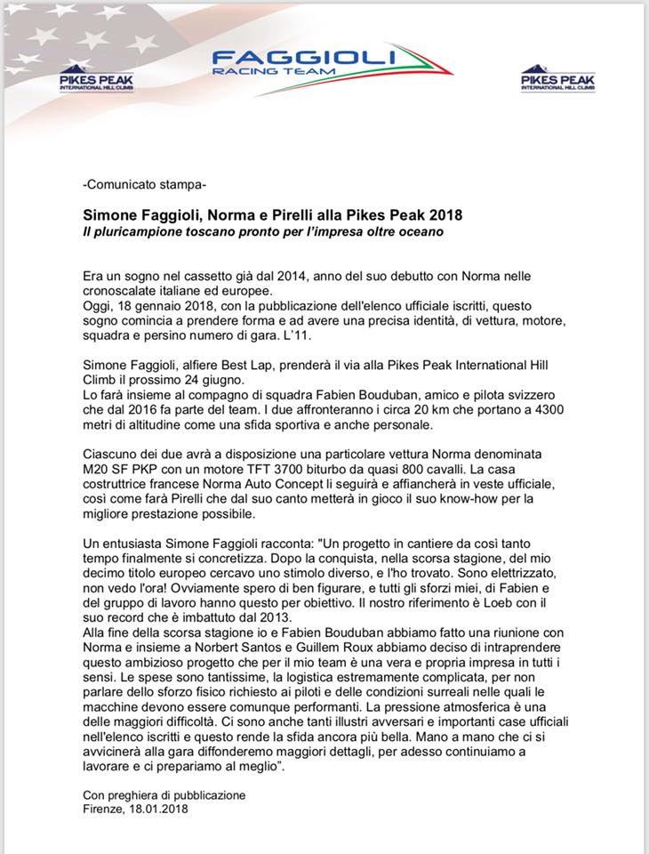 Era ormai nell’ aria da qualche tempo, ma ora è ufficiale: Simone Faggioli sarà in gara alla Pikes Peak 2018, nei prossimi 23-24 Giugno 2018, a bordo di una Norma M20 SF PKP, che monterà un possente motore 3.7 Biturbo, sviluppato da TFT, capace di erogare quasi 800 cavalli.