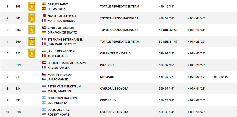 Qui sotto la classifica finale di questa emozionante e durissima Dakar 2018: