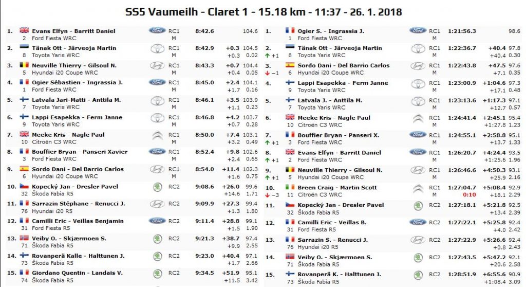 Lo scratch vincente è stato di Elfyn Evans che precede Ott Tanak di soli 3 decimi . Continua dunque l’ottimo momento di Ford e Toyota, fin qui impeccabili. Terzo tempo per Neuville, costretto a recuperare il tempo perduto a causa dell’innevamento di ieri sera e della foratura di stamane.