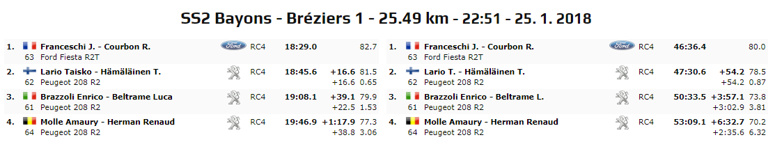 Sebbene non siano iscritti per questa gara al WRC3, sono da segnalare le prestazioni di Yoann Bonato e Nicolas Latil. Il primo, al termine di un secondo passaggio fenomenale dove ha rifilato quasi un minuto a Franceschi, è al comando tra le due ruote motrici mentre il suo connazionale ha fatto segnare un ottimo tempo sulla “Bayons-Breziers”. Migliore anche di quello del leader WRC3 di una ventina di secondi.