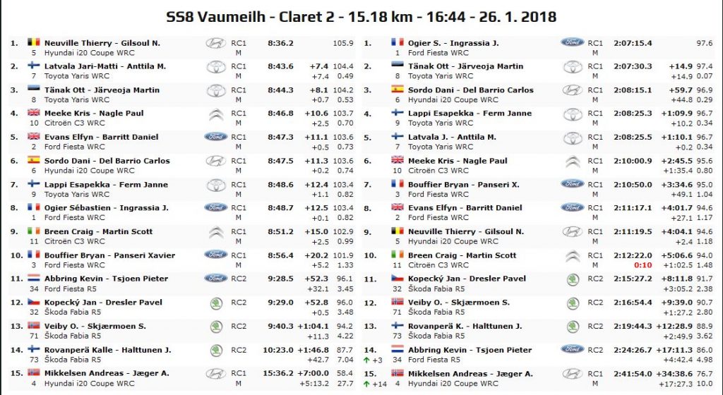 L’ultimo scratch di giornata va a Thierry Neuville che sfrutta come non mai il potenziale enorme della i20. Il belga si dice fiducioso nel recuperare in gran parte il tempo perso. Dietro di lui subito Latvala a +7.4 e Ott Tanak a +8.1. Ottimo inizio stagionale del marchio nipponico dunque. Sordo incrementa ancora di qualche secondo il vantaggio su Lappi e si mantiene saldo al terzo posto, in attesa della lunga tappa di domani. Quarto tempo di stage per Meeke, che inizia ad osare un pochino di più dopo la prima parte di gara molto abbottonata. Solo ottavo tempo per Ogier, che preferisce non rischiare e preparasi alla lotta serrata di domani con un ben gruzzolo di vantaggio su Tanak.