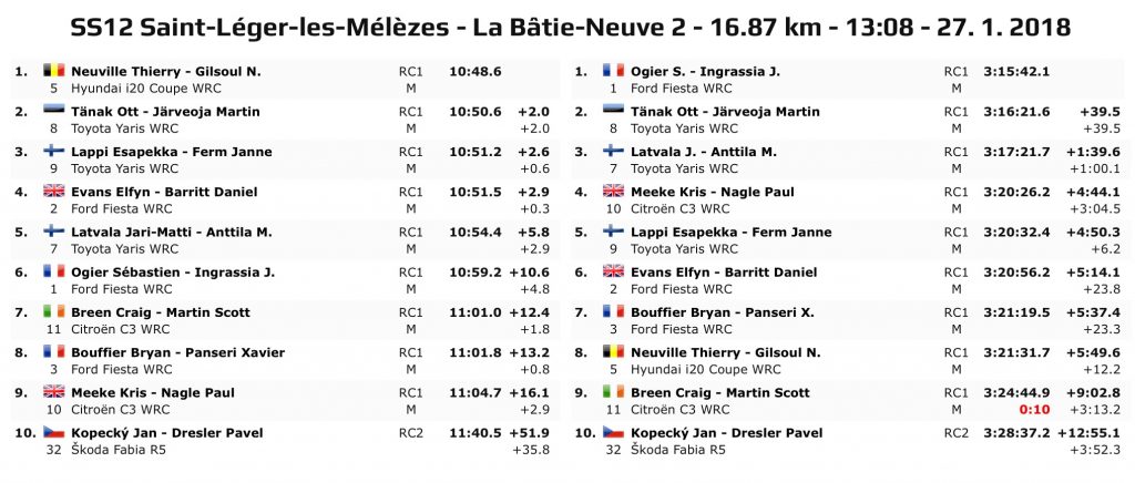 Nello stesso punto vanno dritti in un campo prima Thierry Neuville, poi Bryan Bouffier e infine Kris Meeke. Per loro fortuna non perdono però molto tempo, potendo ripartire senza danni danni alle proprie vetture. Fortuna che invece non premia Esapekka Lappi. L’astro nascente finnico stallona una gomma ed è costretto a fermarsi per cambiarla, abbandonando di fatto tutte le chance di finire a podio. Peccato perchè stava conducendo un Monte Carlo esemplare considerando che si trovava al debutto su queste strade a bordo di una Wrc.
