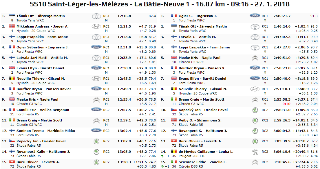 La mattinata è proseguita con la PS10 “Saint-LĂ©ger-les-MĂ©lèzes – La Bâtie-Neuve 1” di 16.87 km. Le condizioni sono in miglioramento, ha smesso di nevicare e verso fine prova non c’è neve, ma solo bagnato. Quindi i piloti si troveranno fondo misto con caratteristiche completamente diverse. Le insidie sono dietro l’angolo. La prova parte nuovamente con Craig Breen a fare da spazzaneve. Mikkelsen e Ogier avvantaggiati dall’ordine.
