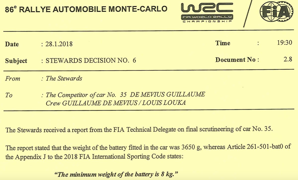 Qui sotto un estratto del comunicato ufficiale della Fia riguardante la penalità di Guillame de Mevius: