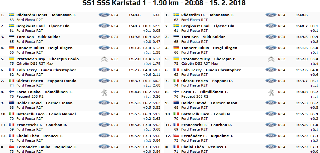 Ad inaugurare la gara nordica è stata come di consueto la prova spettacolo Karlstad 1 da 1,90 km. All’interno dell’ippodromo ornato di fiammate, dossi e gallerie è stato il padrone di casa Radstrom a segnare lo scratch vincente nel wrc3. La sua Fiesta R2T precede di appena un decimo l’altro rampollo svedese, Emil Bergkvist su omonima vettura. Terzo tempo per l’estone Torn.
