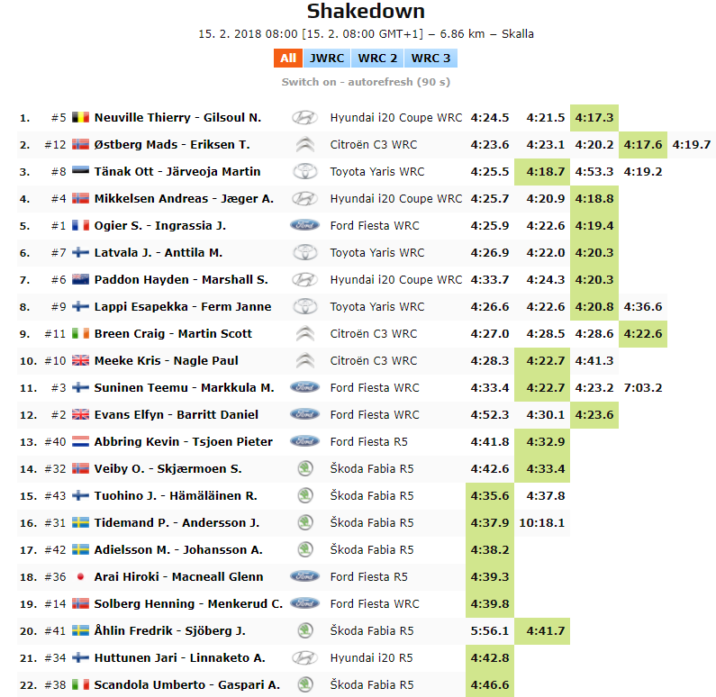 La top 5 è completata da un altro pilota Hyundai, ovvero Andreas Mikkelsen e dal campione del mondo Seb Ogier, quinto, staccato di 2 secondi dal leader.