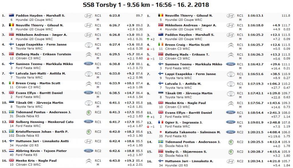 Dello stesso tenore la gara del suo compagno Andreas Mikkelsen che non ha brillato in modo particolare ma è riuscito a massimizzare la posizione arretrata durante tutte le sette prove speciali corse durante la giornata. Diverso è il discorso relativo al pilota kiwi Hayden Paddon che ha sfruttato la mattinata per trovare il giusto feeling e nel pomeriggio ha iniziato a martellare dividendosi le prove speciali del secondo giro con il sorprendente Craig Breen, contento di questa giornata in cui ha chiuso come migliore delle Citroen a soli 0,5 dal podio.