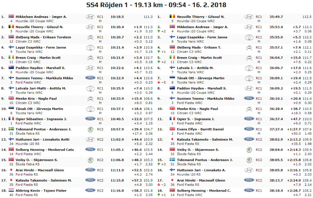 La prima parte del Day1 si chiude con la PS4, “Röjden 1” di 19.13 km. Bella doppietta Hyundai, con in cima Andreas Mikkelsen e Thierry Neuville a seguire. Il belga resta saldo in prima posizione nella generale, nonostante Mikkelsen sia balzato al secondo posto, scavalcando Tanak e Lappi. Proprio Tanak ha chiuso ancora una volta maluccio, decimo tempo che lo ha precipitato alla settima piazza nella generale. L’estone della Toyota ha lamentato grosse difficoltà per via del fondo eccessivamente innevato negli ultimi 6 km di prova. Giustificati quindi il suo tempo e anche quello di Ogier che non fa drammi in quanto si aspettava questo esito. Kris Meeke è invece terminato nono. Il britannico di casa Citroen ha parlato di foratura sul lato destro della sua vettura, ma doveva verificare.