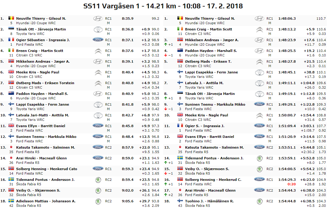 Mattinata di gara chiusa con la PS11 VargĂĄsen 1 coi suoi 14.21 km. Sembra aver risolto i problemi che facevano stare in ansia il team e tutti i tifosi, Thierry Neuville. Il pilota belga della Hyundai difatti vince la prova. Tempi molto ravvicinati coi suoi successori, ovvero Ott Tanak staccato di appena un secondo e Seb Ogier, che finalmente fa capolino nelle parti alte della classifica, attardato di 1″2. Quarto e quinto Breen e Mikkelsen che rafforzano le loro posizioni a podio della generale (rispettivamente 2° e 3°).