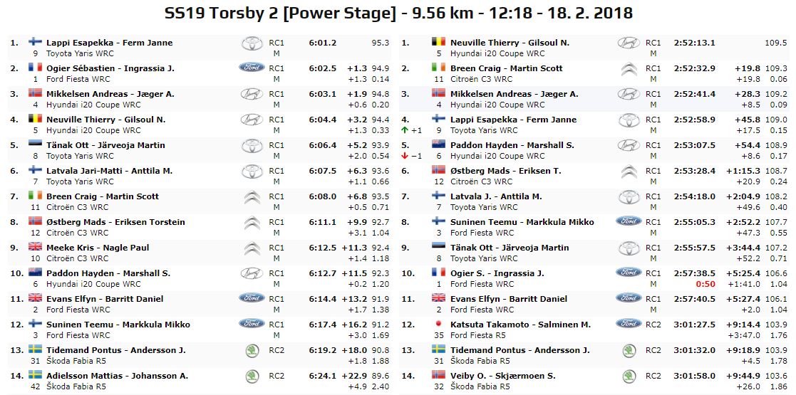 Un riscatto per entrambi, dopo il deludente avvio di stagione a Montecarlo, e che per il belga vale doppio, considerando la vittoria buttata alle ortiche dodici mesi or sono sulle nevi svedesi. Questa volta la lezione è servita, con Neuville che ha saputo gestire al meglio i momenti in cui attaccare e quelli dove amministrare. Certo, i brividi non sono mancati, come il salto sulla Colin’s Crest e qualche altra sbavatura, che però non hanno intaccato il suo grande risultato. Ciliegina sulla torta è la leadership in campionato in solitaria, arrivata grazie anche al weekend a dir poco complicato di tutti i suoi principali rivali ed ai due punti supplementari conquistati nella power stage