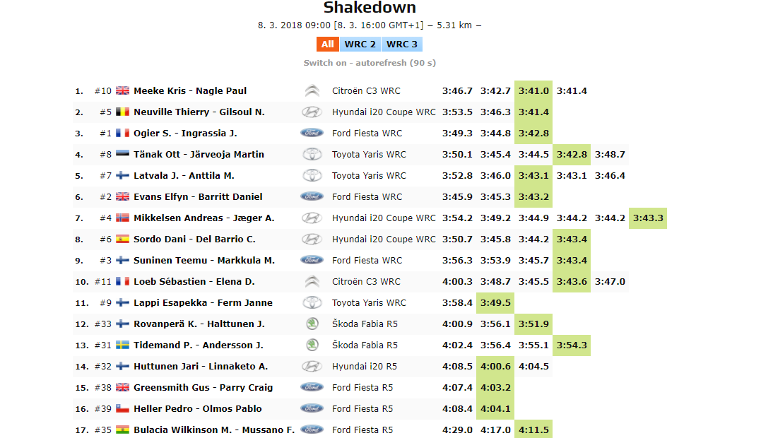 Qui sotto la classifica dello shakedown del Rally del Messico 2018: