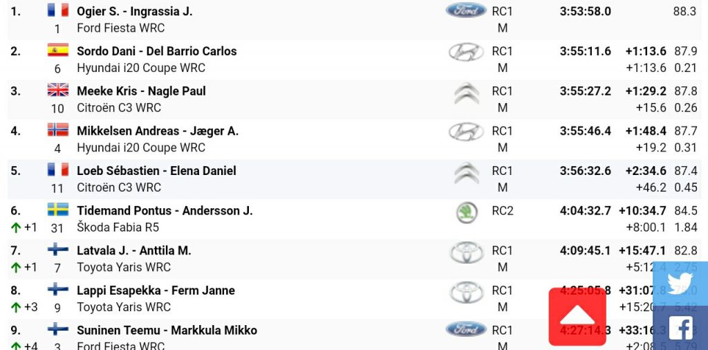 L’equipaggio di M-Sport sfrutta al massimo il potenziale della Ford Fiesta Wrc e va a bissare la vittoria del Montecarlo dopo un weekend a lunghi tratti perfetto e senza sbavature. Piazza d’onore per un ottimo Dani Sordo, coadiuvato da Del Barrio, a bordo della i20 New Generation Wrc. Lo spagnolo fa la gara che non aspetti andando dunque a salvare la faccia a Hyundai, dopo che Neuville e Mikkelsen sono apparsi un po’ in difficoltà  a causa anche di noie meccaniche. Conclude il podio Kris Meeke con la Citroen C3 Wrc. Anche per lui un weekend sulle montagne russe ma comunque un risultato molto positivo per sè e il Double Chevron in ottica Costruttori.