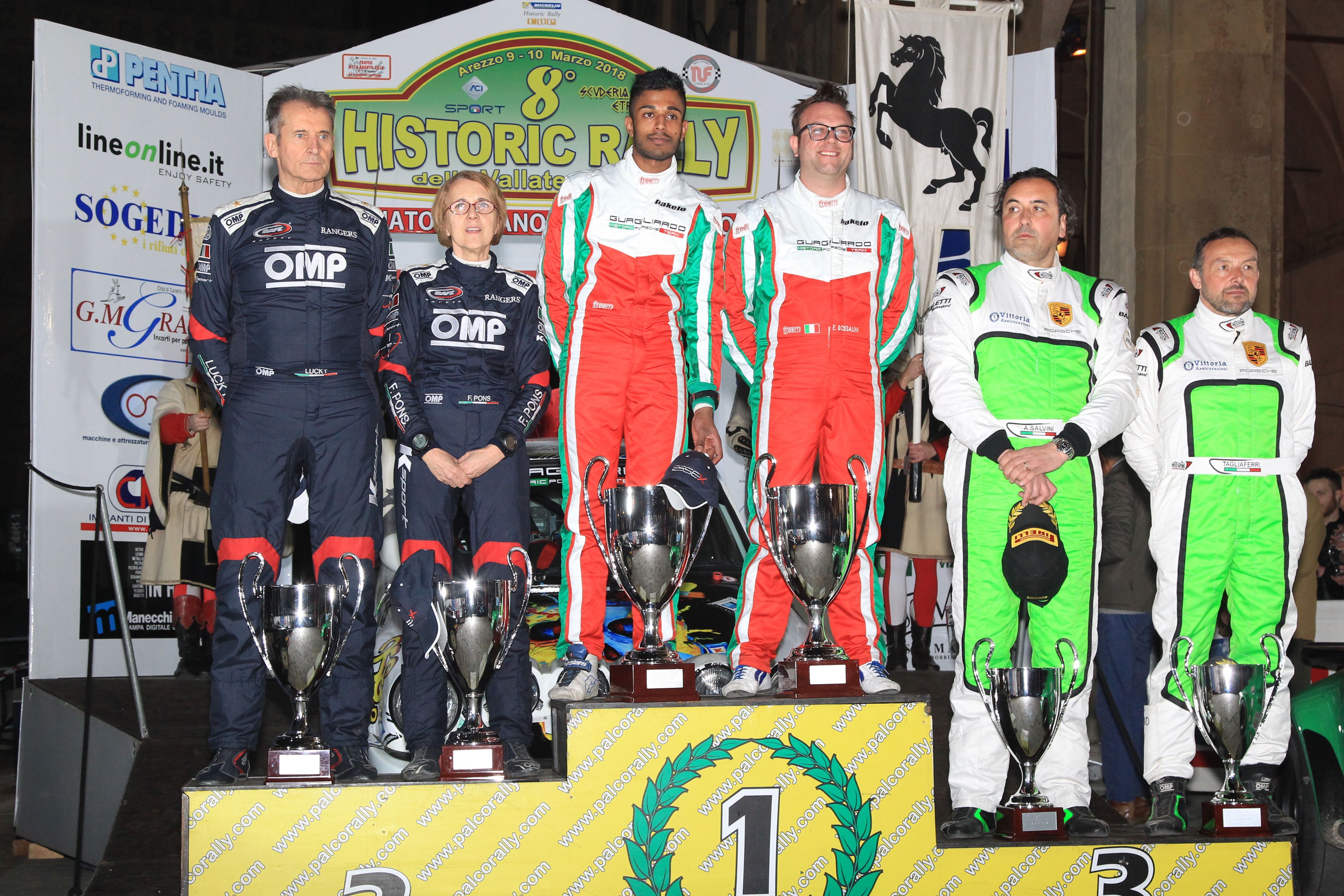 In Piazza Grande ad Arezzo, Luigi “Lucky” Battistolli ha tagliato il traguardo assieme a Fabrizia Pons classificandosi al secondo posto, al termine delle otto prove speciali, aggiudicandosene tre: la prima e le ultime due. Il vicentino campione in carica, con la Lancia Delta Integrale nei colori della Rally Club Team ha dato l’impressione di poter ripetere l’impresa dell’anno precedente, quando vinse la competizione a mani basse, ma l’edizione 2018 s’è ben presto rivelata tutta di rincorsa, nel tentativo di recuperare il divario accusato per un testacoda nella seconda PS.