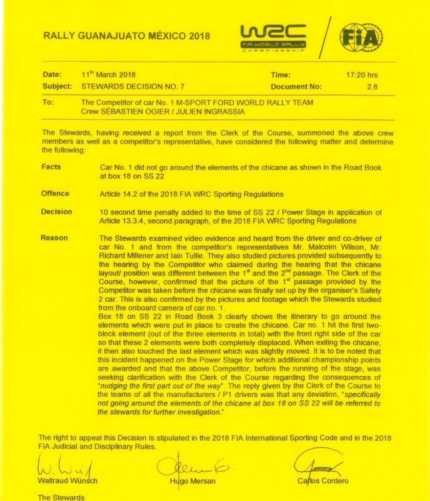 Come recita il comunicato, sono stati visionati i video del suo passaggio sulla SS22 Las Minas 2 e la sua manovra è stata giudicata non conforme al regolamento. All’altezza del box 18 della SS22 viene specificato chiaramente il passaggio attorno ai blocchi della chicane che, invece, sono stati spostati dall’equipaggio francese di M-Sport. Una manovra che, secondo i giudici, diventa decisiva ai fini del risultato.