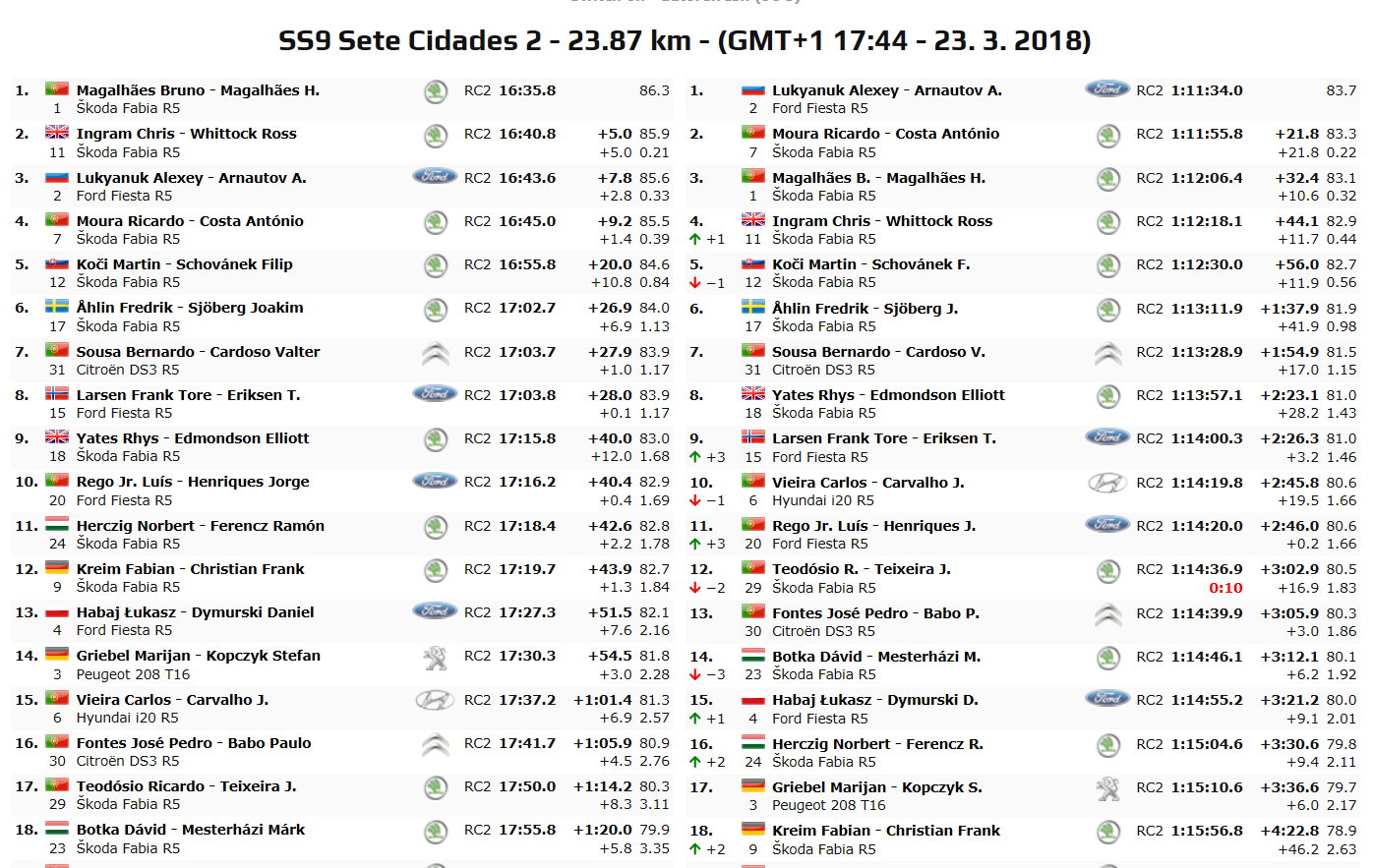 Nelle retrovie abbiamo un altro pilota di casa Bernardo Sousa che è scivolato al settimo posto, superato dallo stesso Ingram e dal terzo dell’ERC Junior U28 Fredrik Åhlin neo “acquisto” dell’ERC che quest’anno ha già avuto modo di trovare feeling con la sua Skoda Fabia R5 nel WRC2 in Svezia, mentre gli ottimi Luis Rego e José Pedro Fontes sono risaliti in ottava e nona piazza. Rhys Yates è finito in testacoda nella PS6 perdendo terreno e finendo ai margini della Top10 e subito dietro il pilota britannico abbiamo il norvegese Frank Tore Larsen (Ford Fiesta R5) e Marijan Griebel (Skoda Fabia R5) un po sotto tono.