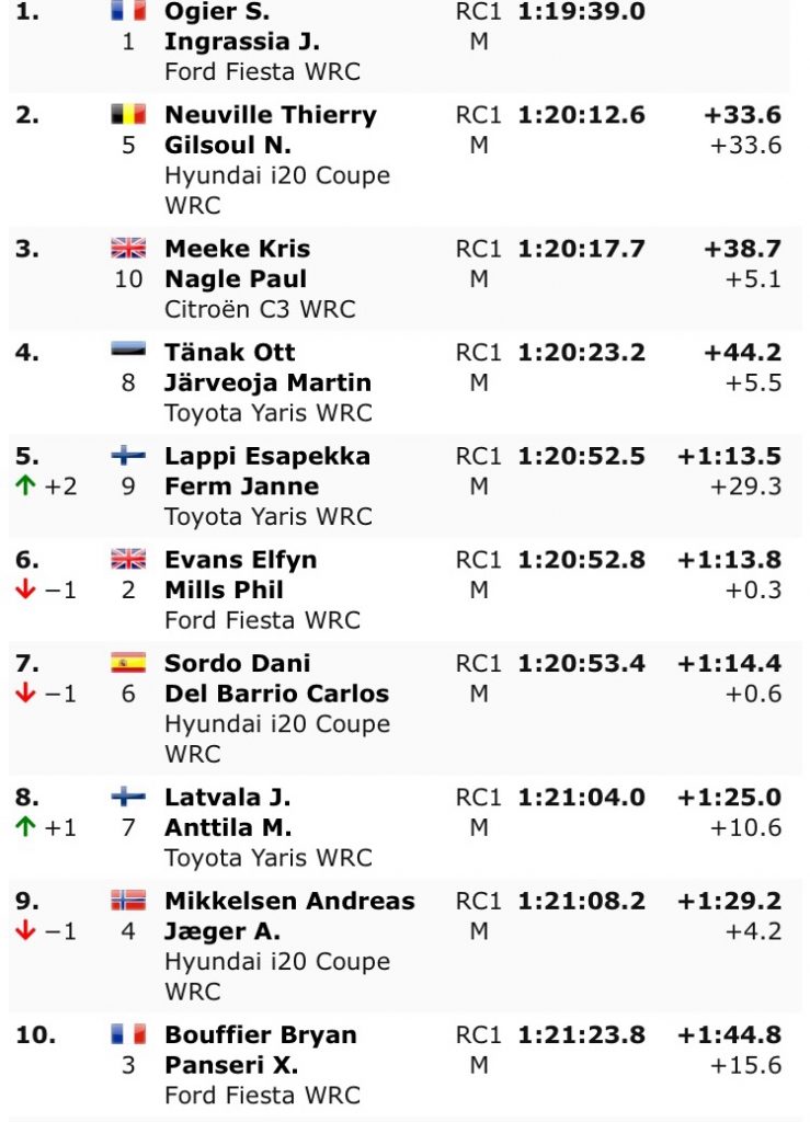 Quinta piazza per un Esapekka Lappi che appare in ripresa, seguito dal gallese Elfyn Evans sulla seconda Fiesta WRC in gara. Completano la top10, lo spagnolo Dani Sordo in settima posizione, Latvala occupa l’ottava piazza, Mikkelsen si piazza nono, mentre chiude la top dieci il francese Bryan Bouffier.